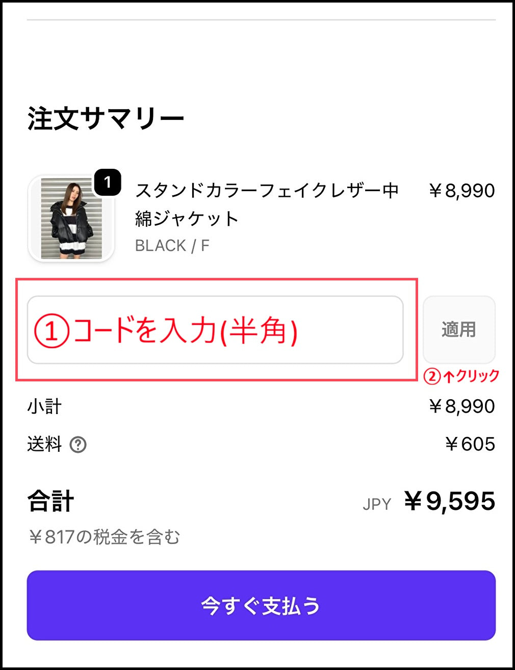 ①「指定のクーポンコード(半角)」を入力し、