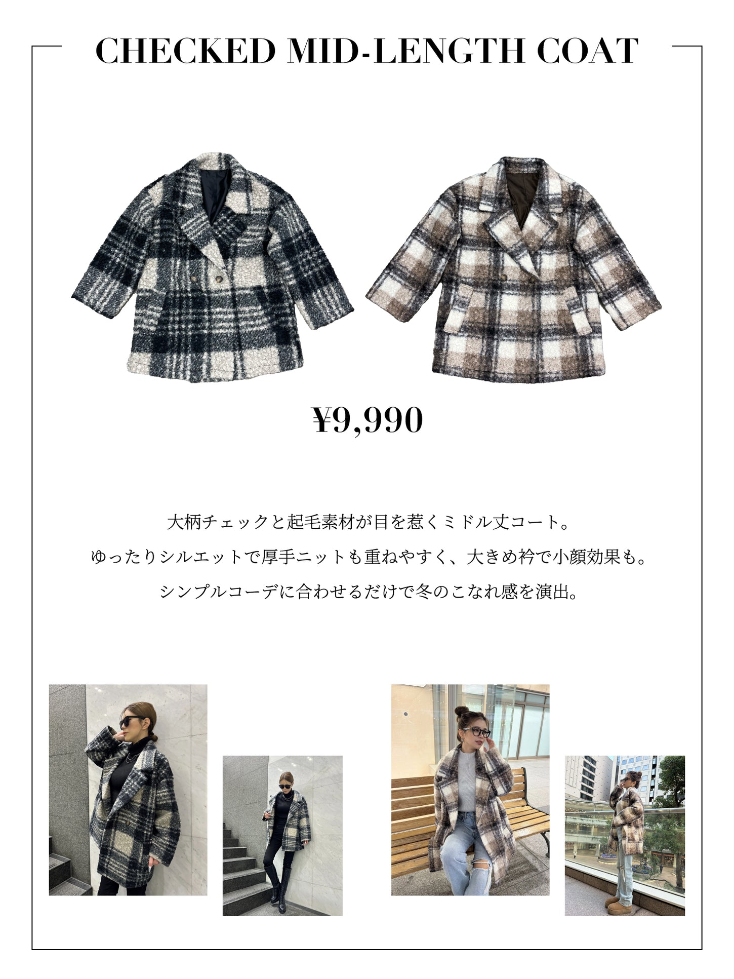 大柄のチェック柄が目を惹くコートは膨らみ感があり、表面を起毛させた暖かみのある素材を使用。羽織るだけでサマになり、女性らしさを際立てます。ゆったりとしたサイジングながらもレディライクで大人な印象のシルエットを意識したデザインに仕上げました。大きめの衿で小顔効果も抜群。首元があくのでタートルネックのトップスやストールなどの合わせも◎袖回りもゆったりしているので厚手ニットの上からでも羽織りやすいです。ミドル丈なので冬のマストアイテムのロングブーツと相性が良いのも嬉しいポイント。柄もののアウターはシンプルなコーデにプラスするだけで一気にこなれ感がでます。【生地感】透け感 :なし 裏地 :あり 伸縮性 :なし 生地の厚さ:厚い 品番 125106912002 素材 表地 ポリエステル 100% 裏地 ポリエステル 100% 原産国 中国 送料 605円(tax in) 返品・交換 返品特約