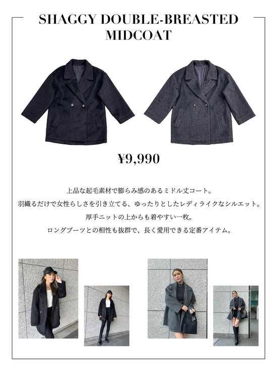 全体的に膨らみ感のある、表面を起毛させた上品な素材感のミドル丈コート。羽織るだけでサマになり、女性らしさを際立てます。ゆったりとしたサイジングながらもレディライクで大人な印象のシルエットを意識したデザインに仕上げました。大きめの衿は小顔効果も抜群。首元があくのでタートルネックのトップスやストールなどの合わせも◎袖回りもゆったりしているため厚手ニットの上からでも羽織りやすいです。ミドル丈なので冬のマストアイテムのロングブーツと相性が良いのも嬉しいポイント。マルチに使える定番型のコートは流行りすたりなく、長い間愛用して頂けます。 【生地感】透け感 :なし 裏地 :あり 伸縮性 :なし 生地の厚さ:厚い 品番 125106912001 素材 表地 ポリエステル 100% 裏地 ポリエステル 100% 原産国 中国 送料 605円(tax in) 返品・交換 返品特約