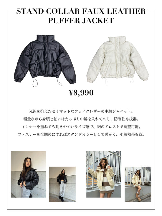 ■detail光沢感を抑えたフェイクレザーの中綿ジャケット。リアルダウンとは違い、お手入れが簡単なのも中綿が好まれている秘訣です。軽量ですが身頃と袖にはたっぷりと中綿をいれているので防寒対策もばっちりで、インナーを着こんでも動きやすいサイズ感です。裾にはドロストがついているためお好みで裾の絞りが調整可能。ファスナーを全閉めにしてスタンドネックにすれば暖かいうえに、小顔効果もあります。セミマットな質感は、綺麗めからカジュアルまで幅広く合わせていただけます。長すぎない丈感がボトムを選ばないので、デイリーユースな一枚です。【生地感】透け感 :なし裏地 :あり 伸縮性 :なし 生地の厚さ:厚い 品番 125116911001 素材 表地 合成皮革 裏地 ポリエステル100% 中わた ポリエステル100% 原産国 中国 送料 605円(tax in) 返品・交換 返品特約