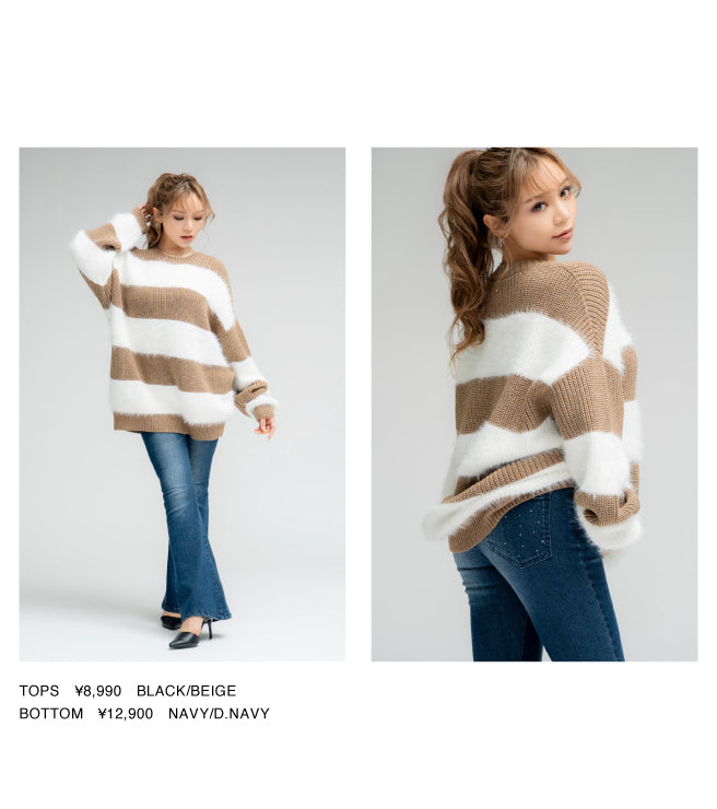 ■detailふわっと柔らかいシャギーときらびやかなアクリルラメニットを使用したボーダーニットップス。太めのピッチボーダーが目を惹き、コーディネートに存在感のあるアクセントをプラスします。袖口にたまるスリーブが着るだけで女性らしい柔らかな印象を演出。ゆったりとしたシルエットが体を優しく包み込み、気負わずにトレンド感を楽しめる一枚です。程よく開いたラウンドネックが、顔回りをすっきりとさせてくれます。着丈はヒップ隠れる長さに設定しているので、ミニボトムとロングブーツを合わせた王道コーデがオススメです。【生地感】透け感:なし裏地:なし 伸縮性:あり 生地の厚さ:厚い 品番 125111002001 素材 アクリル55% ナイロン45% (スリット糸使用) 原産国 中国 送料 605円(tax in) 返品・交換 返品特約