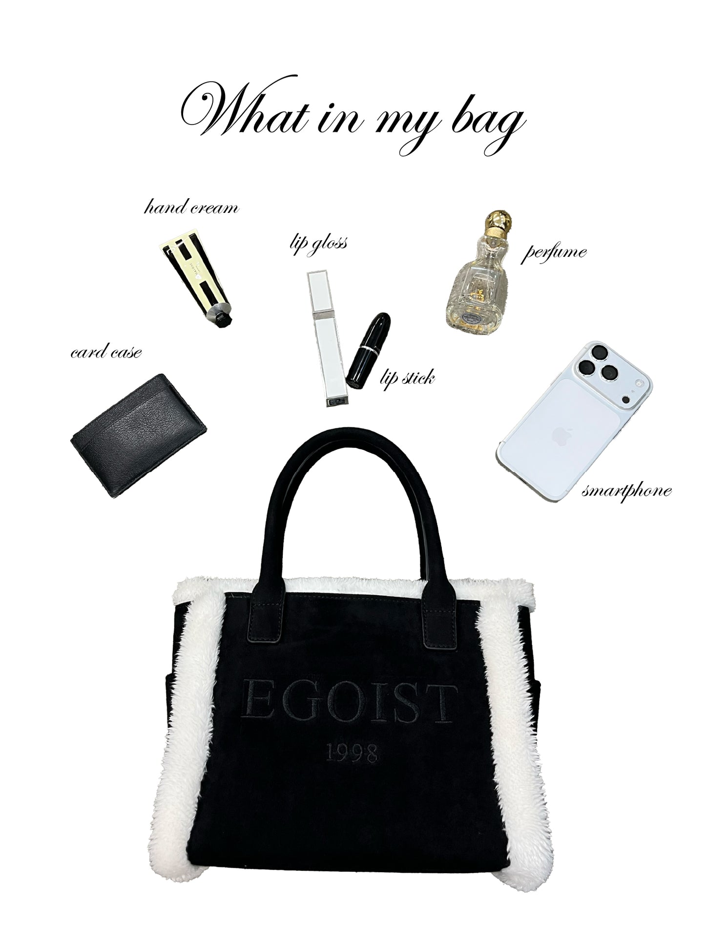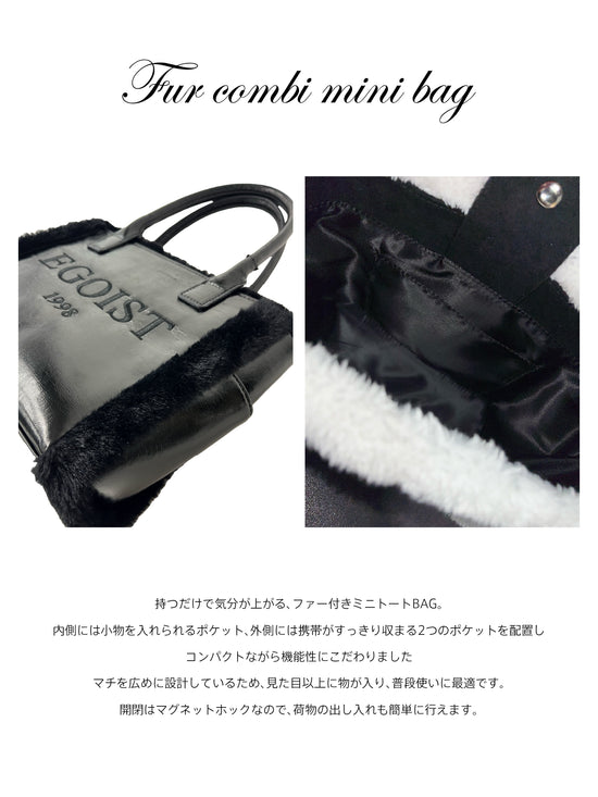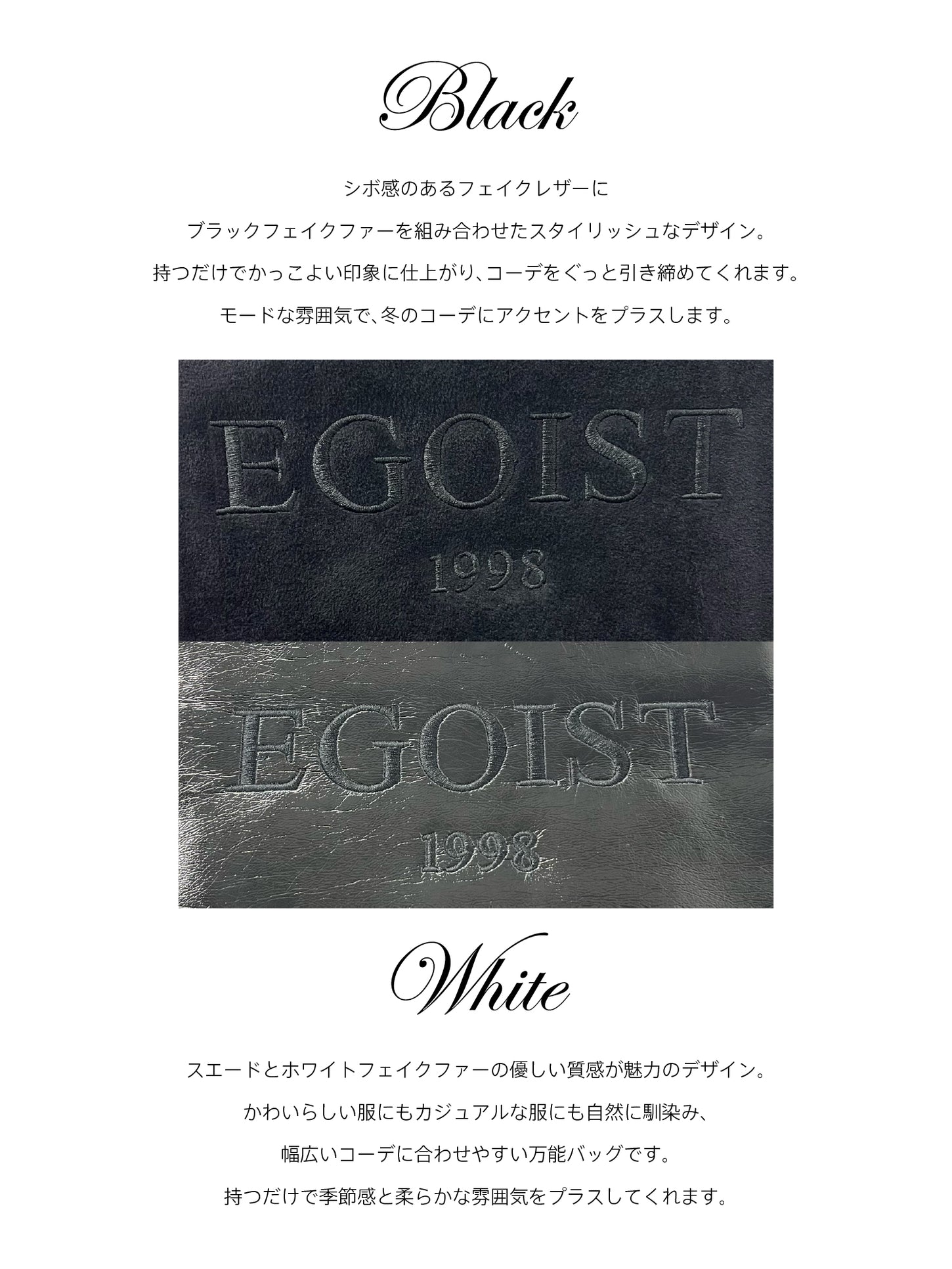 持つだけで気分が上がる、ファー付きミニトートBAG。内側には小物を入れられるポケット、外側には携帯がすっきり収まる2つのポケットを配置し、コンパクトながら機能性に拘りました。マチを広めに設定しているため見た目以上に収納力があり、デイリー使いに最適です。開閉はマグネットホック仕様で、中身の出し入れもしやすいです。フロントには華奢で綺麗目なフォントの【EGOIST】ロゴと、ブランド創立年【1998】のナンバーを黒刺繍で施し、さりげない存在感をプラス。秋冬コーデに華やかさを添え、持つだけで主役級の存在感を放つEGOISTならではのミニトートです。今はやりのキーホルダーを付けてオリジナルBAGにしても◎ BLACK:シボ感のあるフェイクレザー×BLACKフェイクファーWHITE:スエード×WHITEフェイクファー。 品番 125118214001 素材 本体 合成皮革 パイピング ポリエステル100% 裏地 ポリエステル100% 原産国 中国 送料 605円(tax in) 返品・交換 返品特約